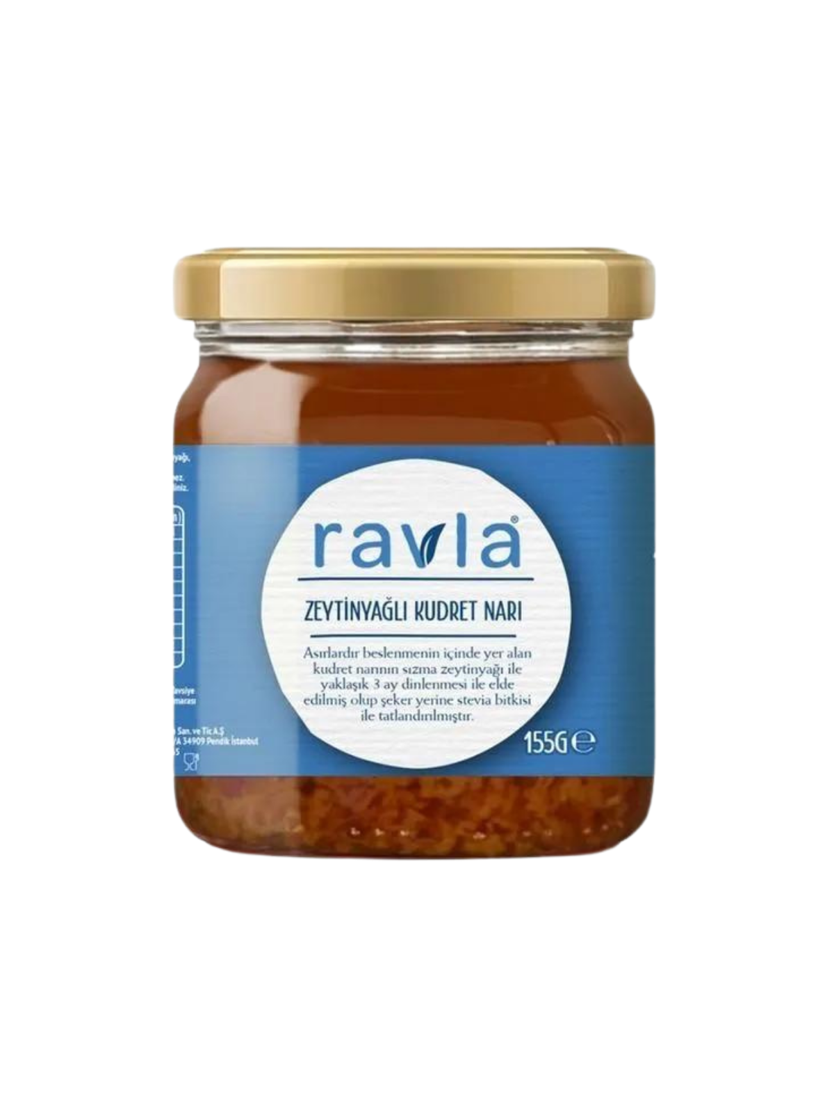 RAVLA Zeytinyağlı Kudret Narı Kudret narı, kabakgiller familyasından tropik iklim bölgelerinde yetişen gıda ve ilaç olarak kullanılan bitki türüdür. Ravla olarak yüksek polifenollü zeytinyağımız meşe propolisimiz ve doğal tatlandırıcı olarak kulllanılan ve insan sağlığında faydaları kabul görmüş stevia bitkisi ile yumuşak hoş tadı elde edilerek Ravla’ya özel formülasyon ile hazırlanmıştır. 200GR.